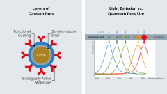 Quantenpunkte oder Quantum Dots (QD) sind winzige Kristalle im Nanometerbereich. Sie bestehen aus einem Cluster von Halbleiteratomen, oft umhüllt mit einer weiteren Halbleiterschicht. Eine äußere funktionelle Polymer- oder Lipidbeschichtung ermöglicht eine Kopplung mit Proteinen, Oligonukleotiden (kurze DNA- oder RNA-Moleküle), Antikörpern oder anderen Molekülen (Abbildung 1). Die Abmessungen zwischen 2 bis 10nm, das sind etwa 10 bis 150 Atome, ergeben bemerkenswerte optische und elektrische Eigenschaften.